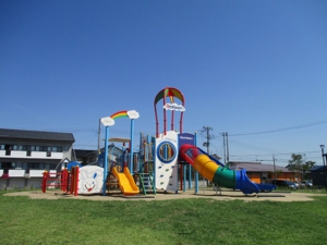 防災機能を備えた公園で、大型遊具や広々とした芝生広場があります。